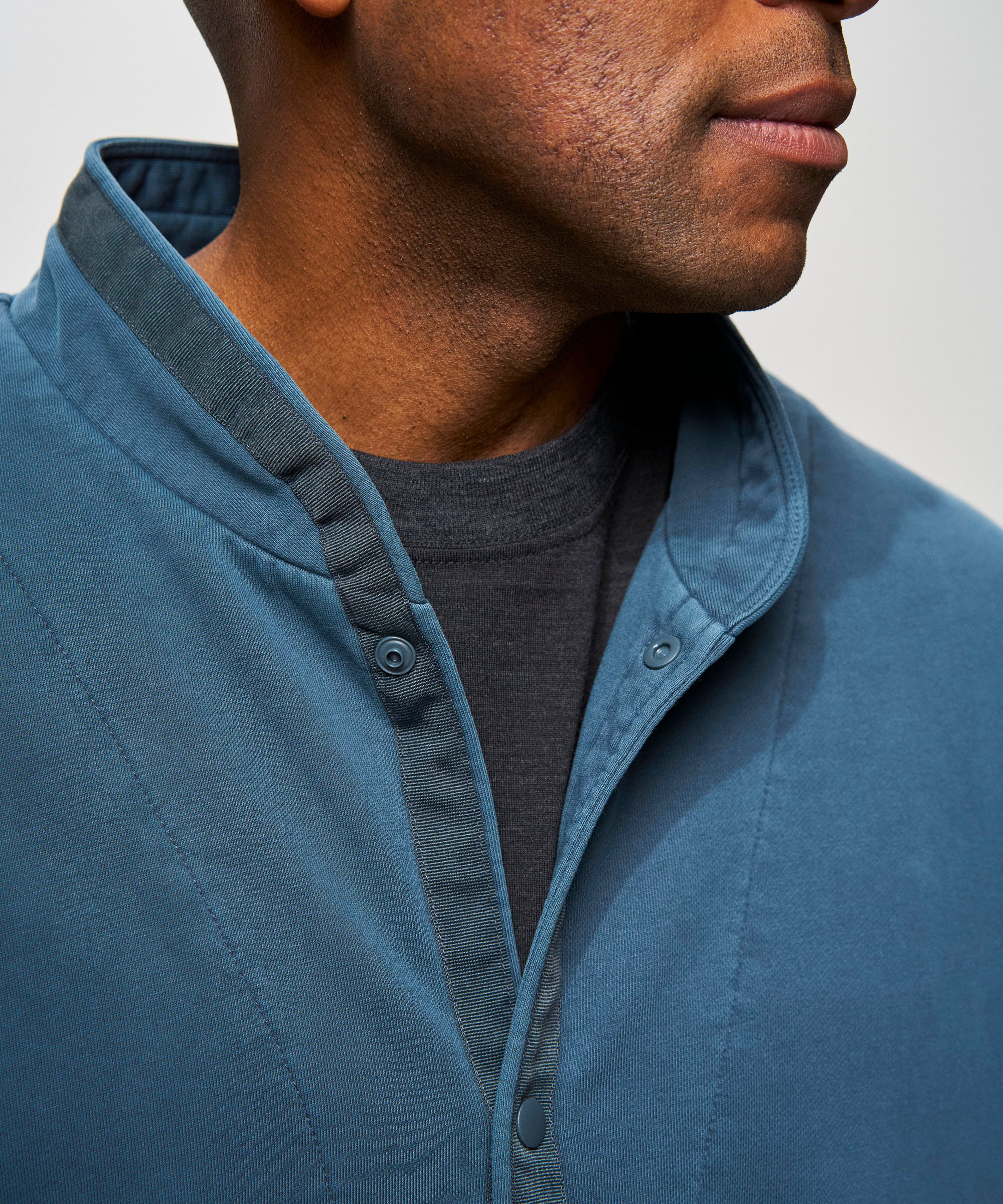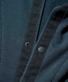 優しい印象を与える先端を丸くしたネックデザイン、ミドルスクールアウトドアウェアから着想したスナップボタン+グログランテープが特徴です。
